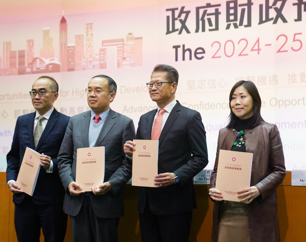 2月28日,香港特區政府財政司司長陳茂波(右二)等向記者展示2024/2025財政年度特區政府財政預算案文本。新華社記者 王申 攝