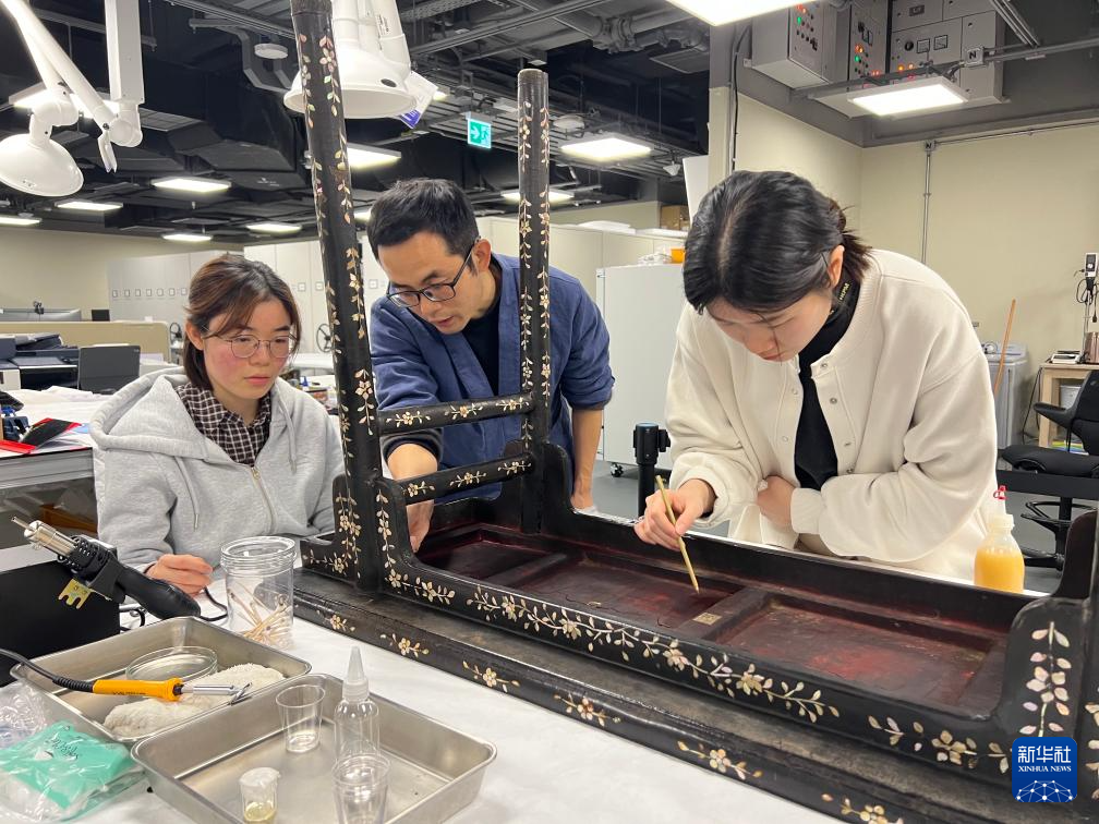 這次修復的另一類文物是漆器,對于溫度、濕度的變化有嚴格要求?!跋愀酃蕦m文化博物館在接到這件明代黑漆嵌螺鈿桌案時發現,桌案不僅出現了裂縫,還有螺片的脫落與缺失?!绷杭畏耪f。