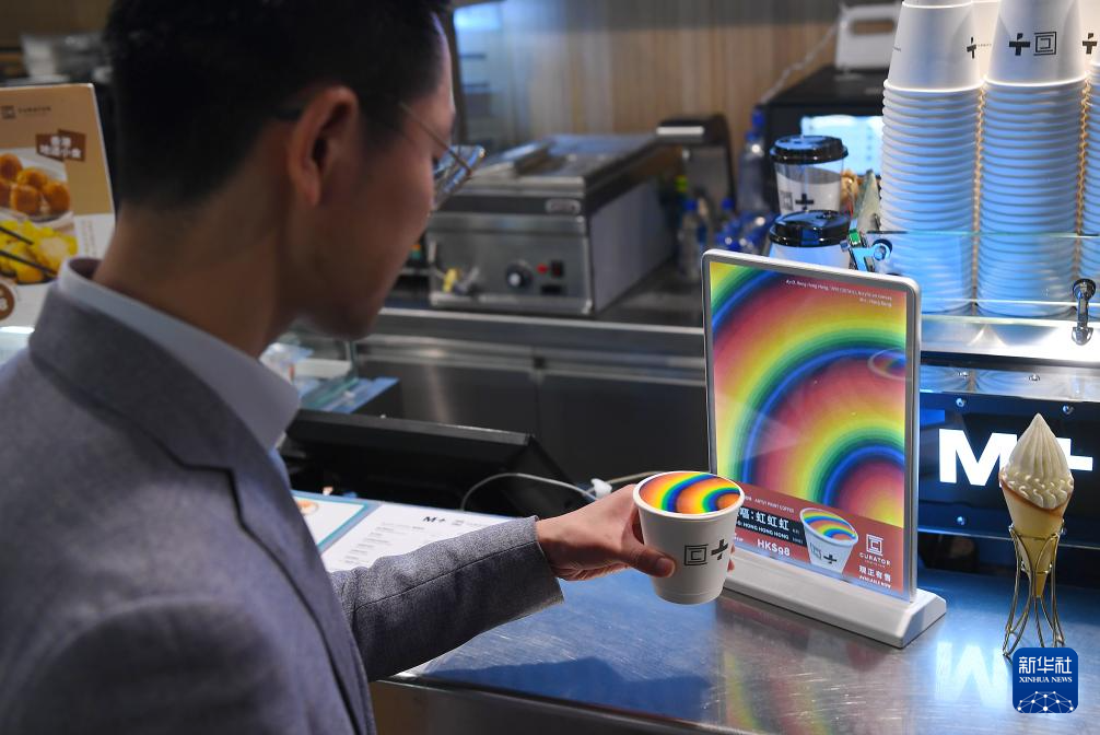 在香港視覺文化博物館M+的咖啡店,市民李小姐驚喜地發現,這里竟然有一款彩虹咖啡,其圖案色彩與前不久在此展出的日本彩虹藝術家的作品一模一樣。得知這是經作者授權的藝術打印咖啡,李小姐立刻點了一杯,并開心地自拍留念。