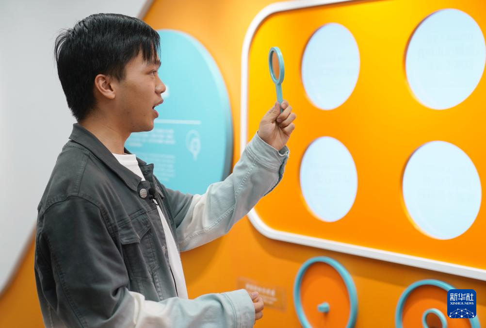香港學生李駿耀在位于香港港島金鐘的“禁毒資訊天地”講述他和禁毒的故事(4月30日攝)。新華社記者 王申 攝