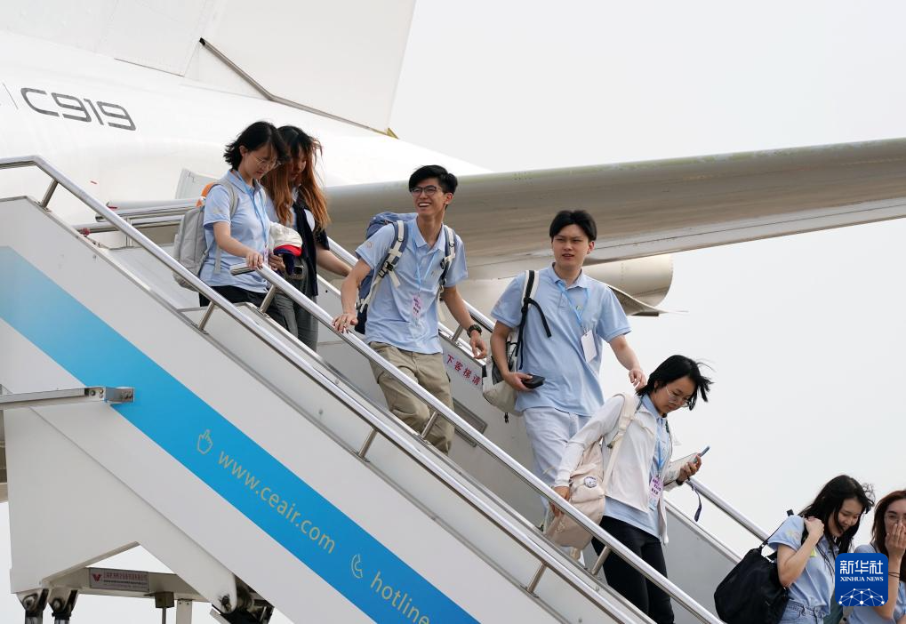 6月1日,乘坐C919飛抵上海的香港青年學子陳柏橋(左三)與同伴走下舷梯。新華社記者 劉穎 攝