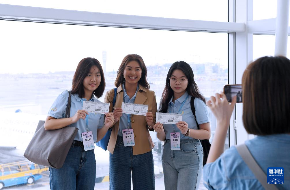 6月1日,嘉賓與前往上海的香港青年實習生在香港機場合影。新華社記者 陳鐸 攝