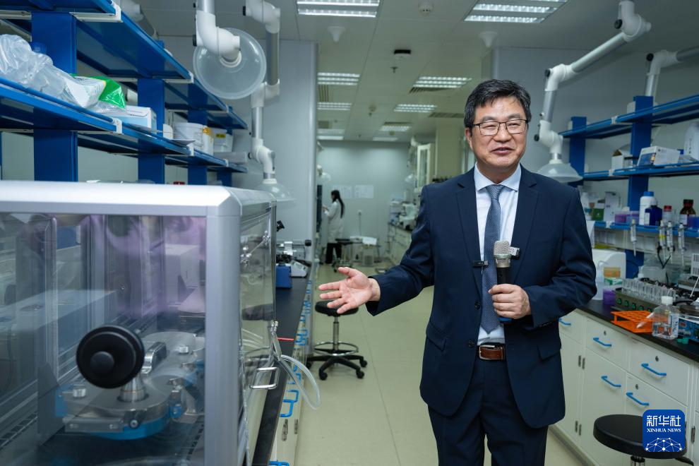 6月17日,中藥質量研究國家重點實驗室(澳門大學)主任、澳門大學中華醫藥研究院院長陳新介紹實驗室情況。新華社記者 張金加 攝