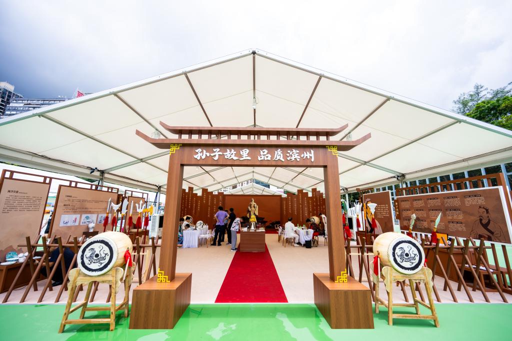 山東濱州的展區形似春秋時期的軍帳,正中矗立著兵圣孫子的雕像,兩側牌匾上刻有《孫子兵法》的經典篇章。