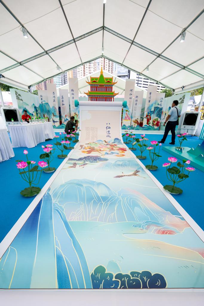 展廳中央,一幅巨大的卷軸將“八仙過?!钡膫髡f娓娓道來。卷軸上,八仙人物各顯神通,兼顧古典韻致和現代審美,場景栩栩如生。