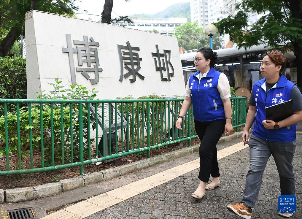 4月18日,博康關愛隊隊長、沙田區區議員郭宣彤(左)與隊員從博康邨內走過。新華社記者 陳鐸 攝