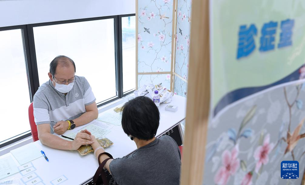 4月11日,在荃灣區馬灣中醫義診活動中,一名中醫師為居民號脈。新華社記者 陳鐸 攝
