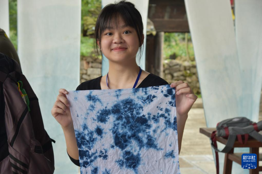 7月3日,香港學生在貴州省務川縣龍潭村展示制作的扎染作品。新華社記者 駱飛 攝