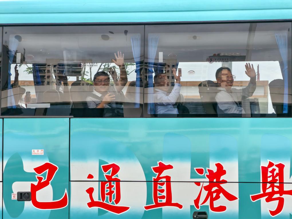 首輛進入深中通道中山翠亨東收費站的車輛上,乘客揮手致意。新華社記者 劉大偉 攝