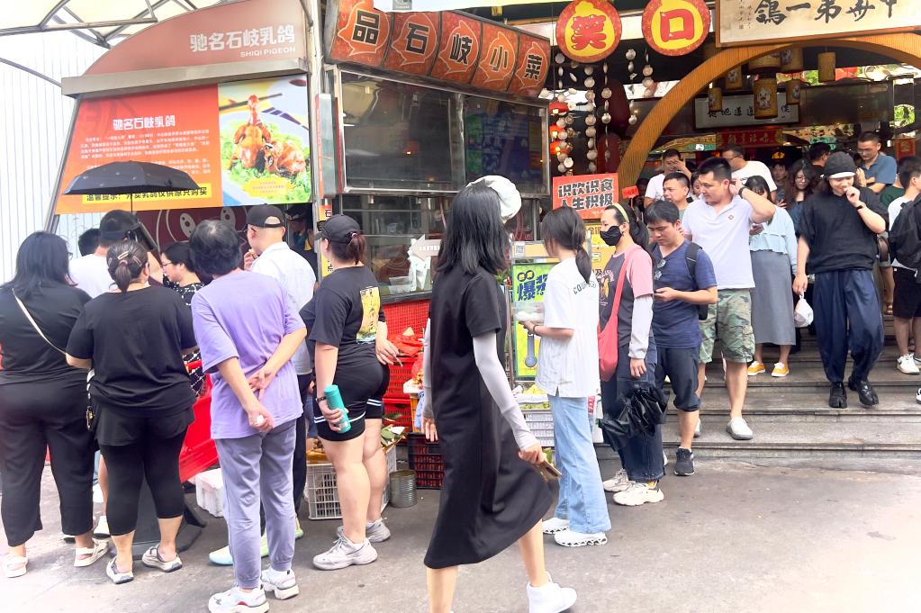 7月20日,港深游客在中山特色餐館門前排隊購買乳鴿。新華社記者 熊嘉藝 攝