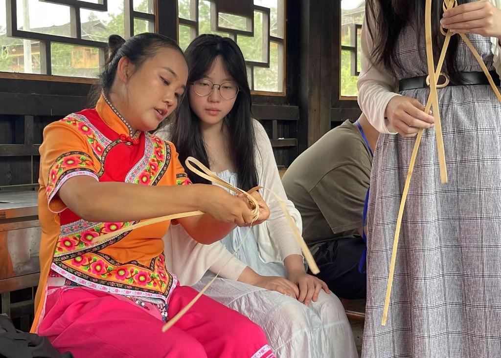 7月3日,香港學生在貴州省務川縣龍潭村體驗仡佬族“篾雞蛋”編織技藝。新華社記者 駱飛 攝