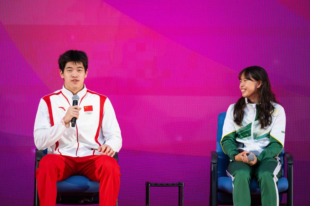 9月1日,游泳運動員潘展樂(左)在活動中回答澳門運動員的提問。當日,內地奧運健兒代表團在澳門奧林匹克體育中心室內體育館與澳門青少年運動員進行互動交流。新華社記者 張金加 攝
