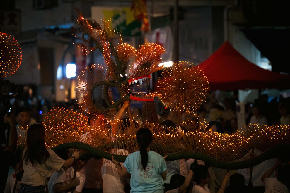 在香港大坑,一條“龍”渾身插滿點燃的香,震天響的鑼鼓聲中,數百位舞龍者奮力舞動,“火龍”盤旋騰飛,一會兒“神龍擺尾”,一會兒“喜結龍團”,引得人群發出陣陣喝彩……中秋月圓夜,擁有百余年歷史的大坑舞火龍如約而至。