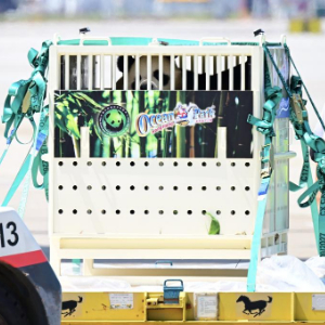 26日的香港,陽光燦爛。當專機落地停穩后,工作人員立刻登機對兩只大熊貓進行健康檢查。約半小時后,機艙門開啟,“安安”“可可”在貼有各自照片的兩只運輸籠內先后經升降梯緩緩降落至搬運車,隨后前往貨運站。