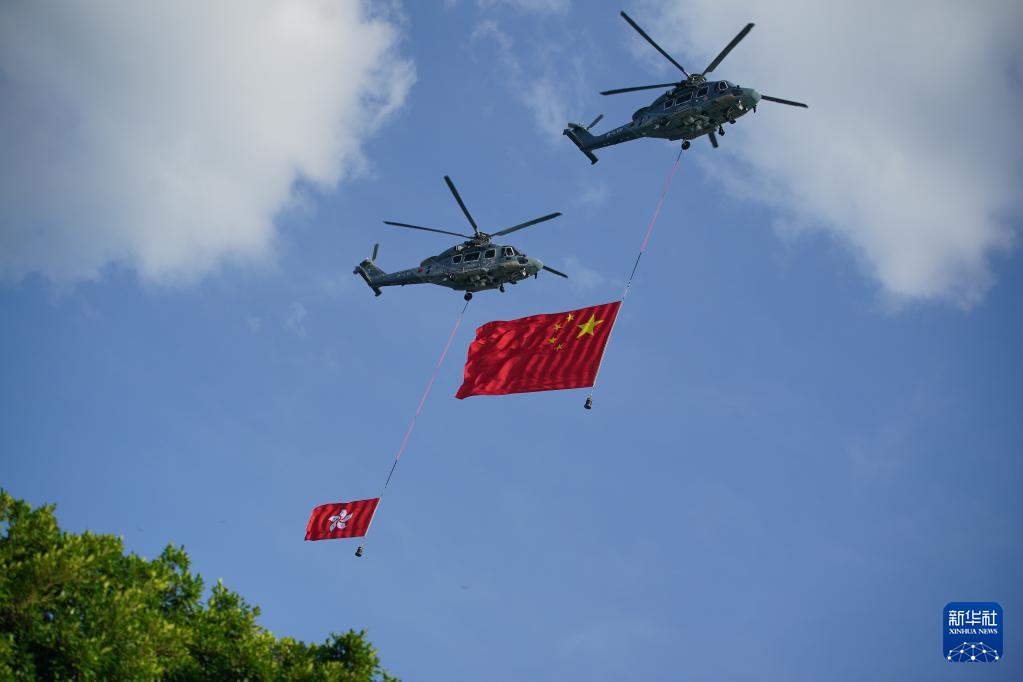 10月1日,香港特區政府舉行升旗儀式和酒會,慶祝新中國成立75周年。這是分別懸掛中華人民共和國國旗、香港特區區旗的直升機從空中飛過。新華社發(呂小煒 攝)
