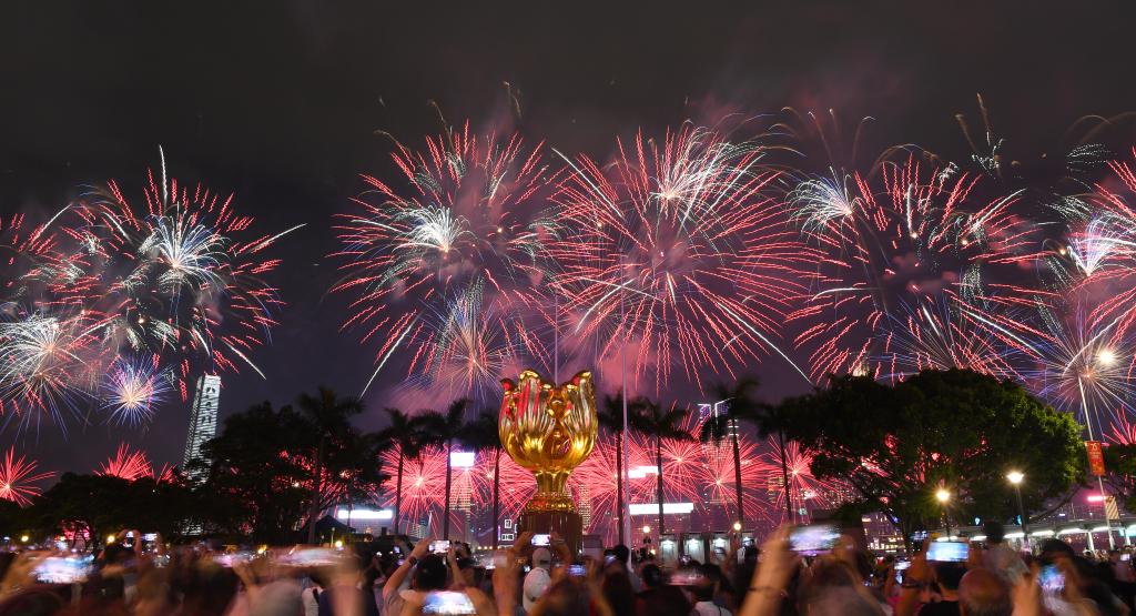 10月1日晚,香港國慶煙花匯演在維多利亞港舉行,慶祝中華人民共和國成立75周年。新華社記者 陳鐸 攝