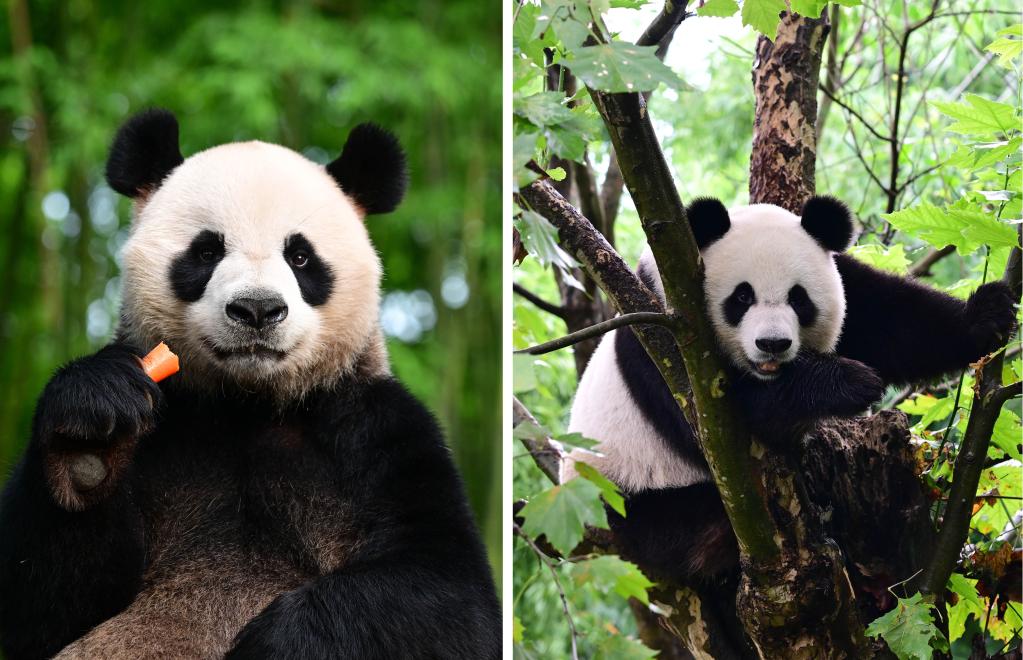 拼版照片:左為大熊貓“安安”,右為大熊貓“可可”。9月26日,第三對中央政府贈港大熊貓“安安”“可可”搭乘專機前往香港定居海洋公園。新華社發(中國大熊貓保護研究中心供圖)