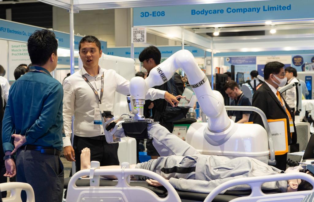 2024年5月17日,在第十五屆“香港國際醫療及保健展”上,展商向參觀者介紹科技醫療產品。新華社記者 龍鏡伊 攝