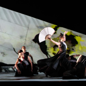 啟發他運用動態捕捉技術,讓舞者手執器材在空中揮毫,并將所錄得的“筆劃”與舞者的腦電波數據結合。當舞臺上落下黑色的半透紗幕,數據化為錯綜變幻的墨跡,又像跳動的心臟,與舞者相輝映,層次豐富。