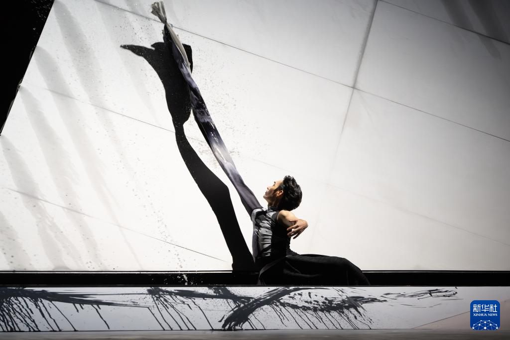 香港舞蹈團《快雪時晴》在舞臺設計上加入水墨元素,舞者與之互動會留下書法般的痕跡(10月11日攝)。 新華社發(香港舞蹈團供圖)