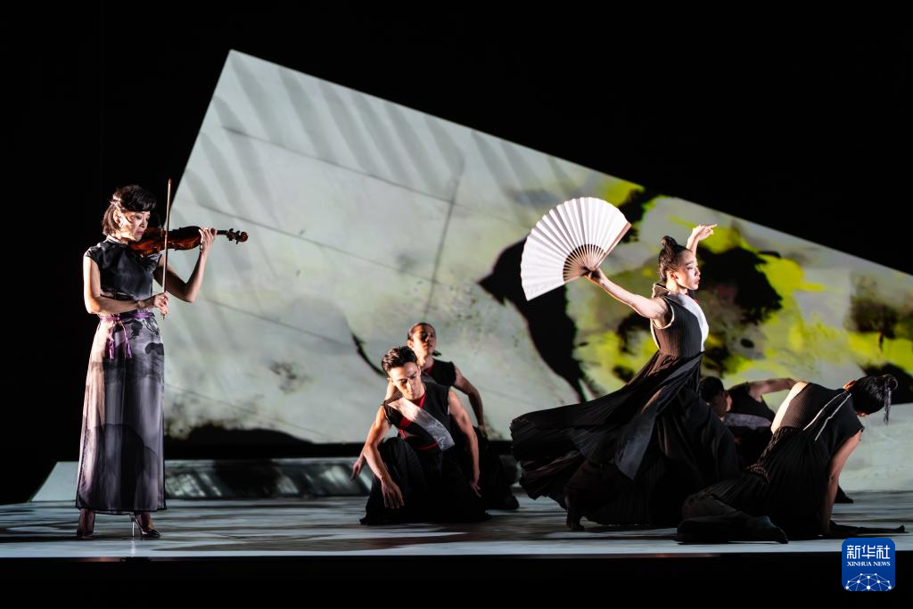 10月11日,香港舞蹈團《快雪時晴》在香港西九文化區戲曲中心上演,糅合舞蹈、書法、武術、弦樂及新媒體的跨界元素。 新華社發(香港舞蹈團供圖)