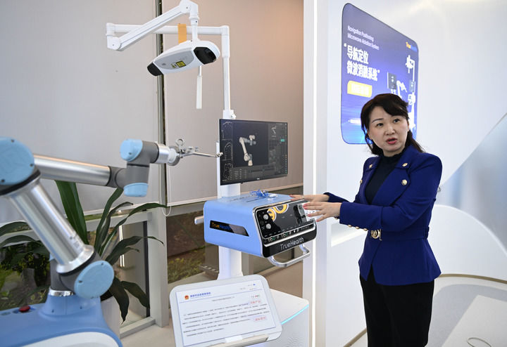 澳門企業真健康(廣東橫琴)醫療科技有限公司創始人張昊任在介紹“導航定位微波消融系統”(2024年11月24日攝)。新華社記者 鄧華 攝
