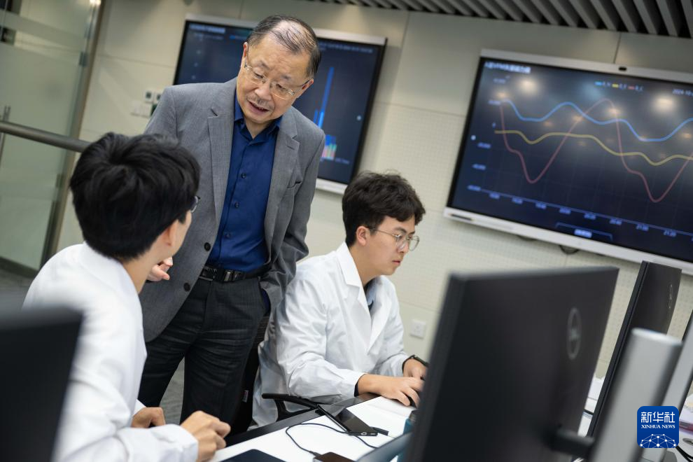 12月4日,“澳科一號”衛星項目助理研究員尹亮(左一)與同事交流。 新華社發(張金加 攝)