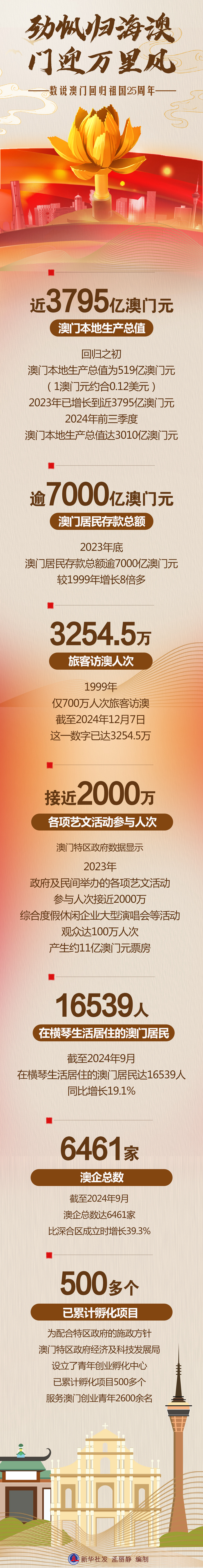 回歸祖國25年來,在“一國兩制”方針指引下,在中央政府和祖國內地的大力支持下,澳門實現向現代化國際都市的華麗轉身。澳門特別行政區政府與社會各界攜手并進,積極探索適合自身的發展路徑,在經濟、民生等領域取得顯著成就。 新華社發 孟麗靜 編制