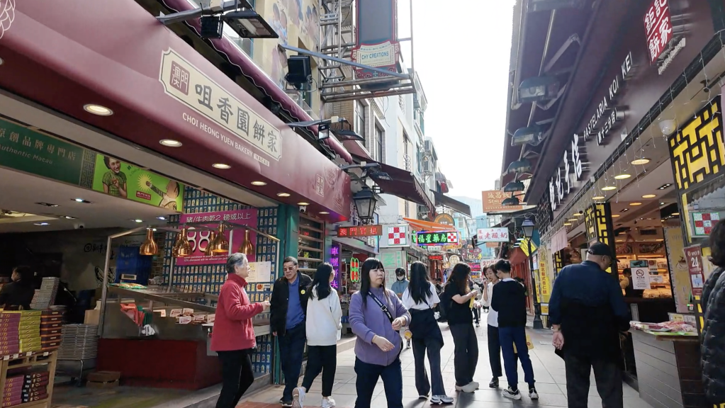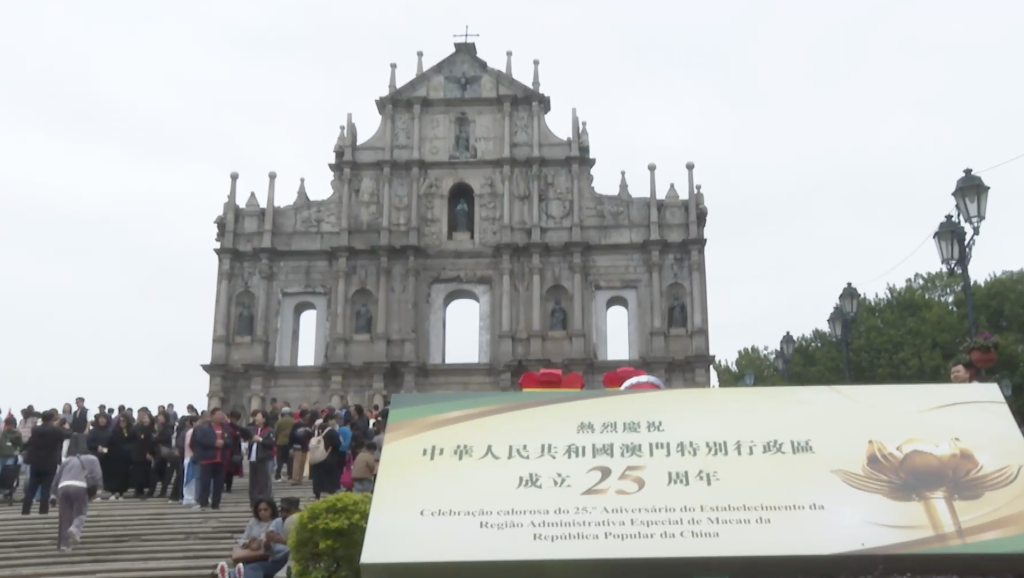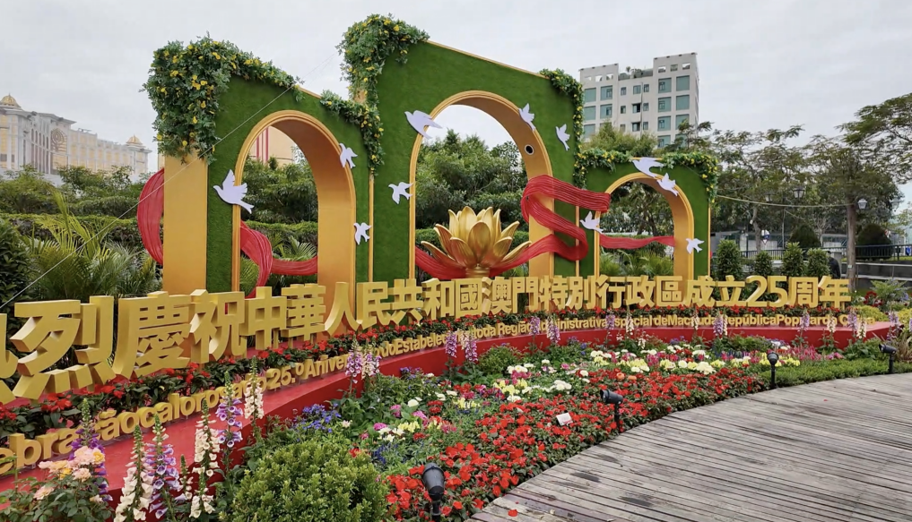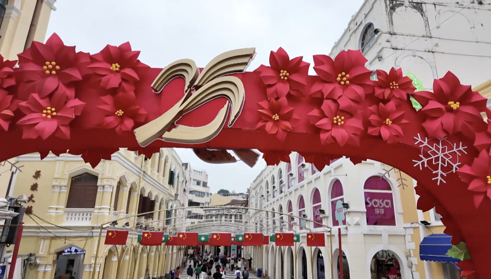 12月的澳門街頭,處處洋溢著節日喜慶氣氛。在議事亭前地的板樟堂街,國旗和區旗交相輝映;大三巴牌坊前立起慶祝澳門回歸祖國25周年的招牌;“回歸的旋律”主題花展前游人如織;氹仔舊城區的重要組成街道之一官也街更添喜慶與熱鬧。