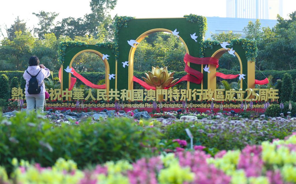 2024年12月17日,市民在澳門一處慶?;▔芭恼?。新華社記者姚琪琳攝