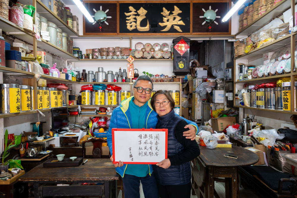 12月18日,澳門英記茶莊的傳承人盧石麟(左)與夫人在展示祝福語。