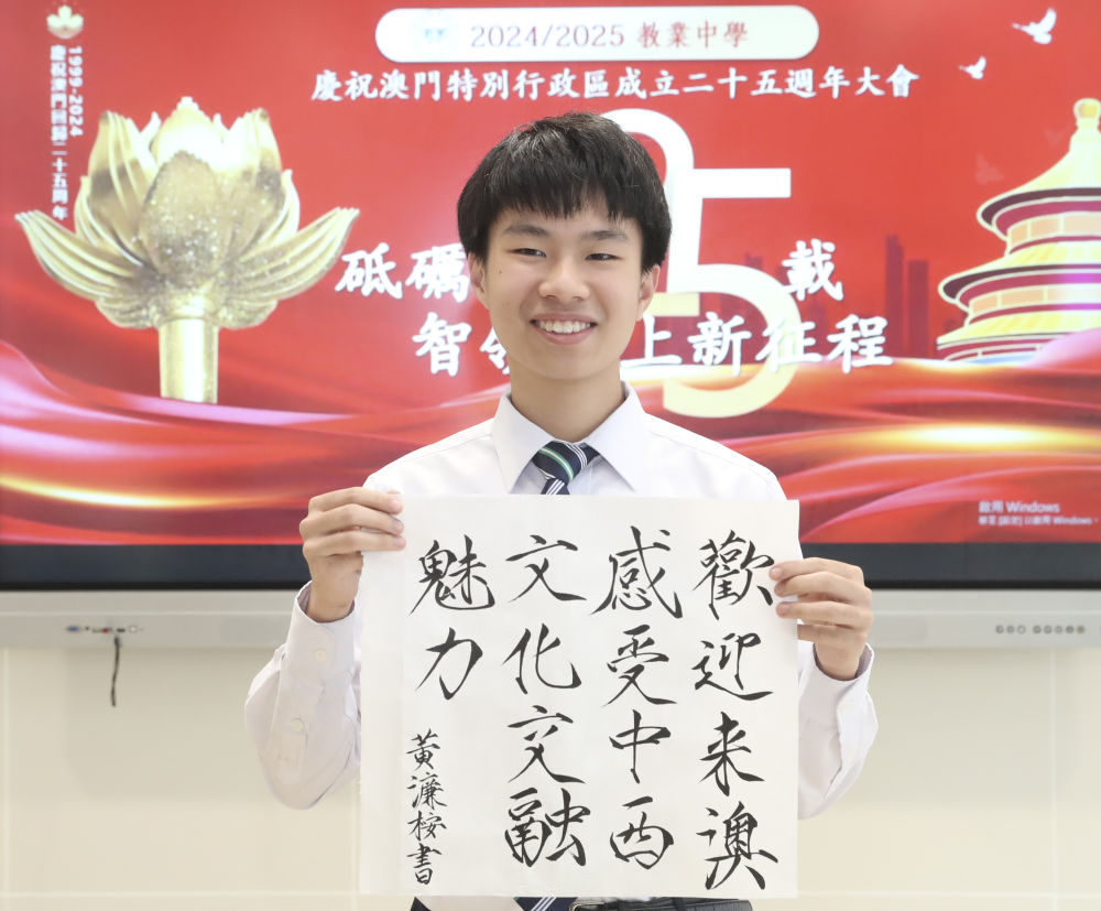 12月18日,澳門教業中學高一學生黃濂桉在展示祝福語。