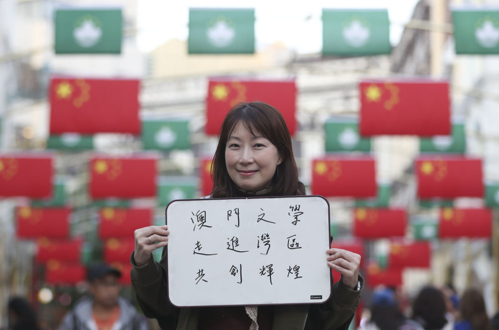12月18日,澳門中銀員工王金思在展示祝福語。