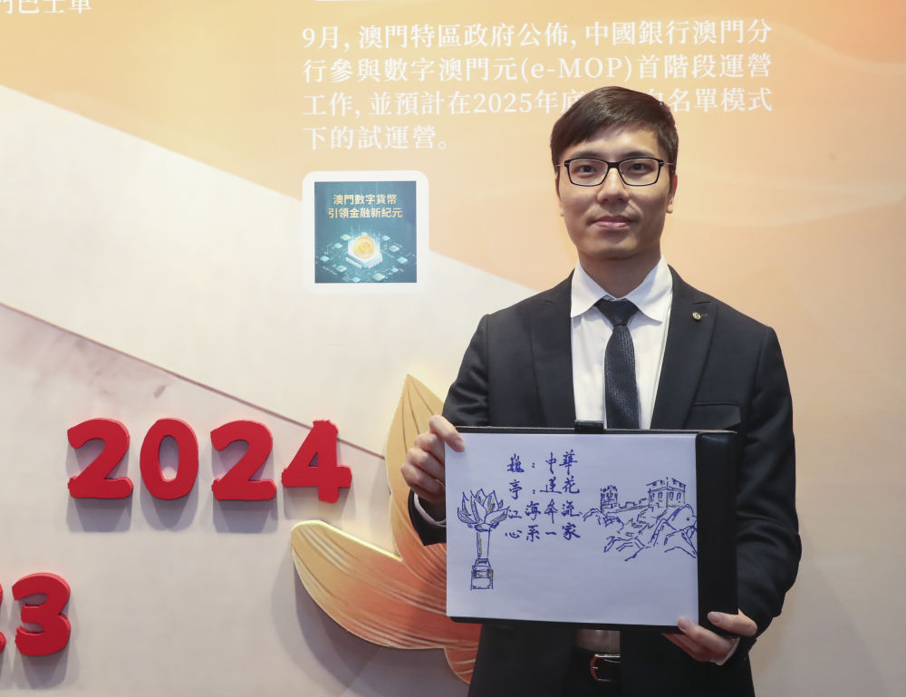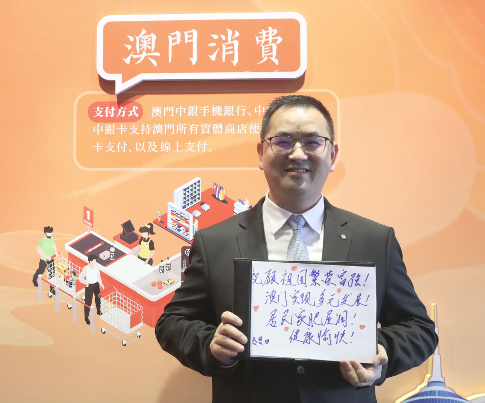 12月18日,澳門中銀員工梁銘坤在展示祝福語。