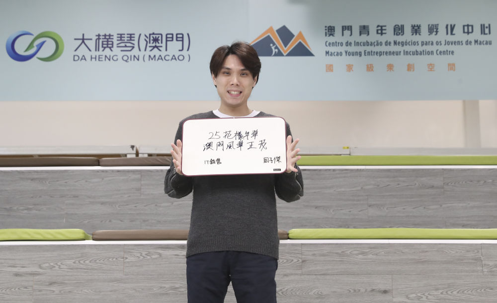 12月18日,澳門IT銷售周子傑在展示祝福語。