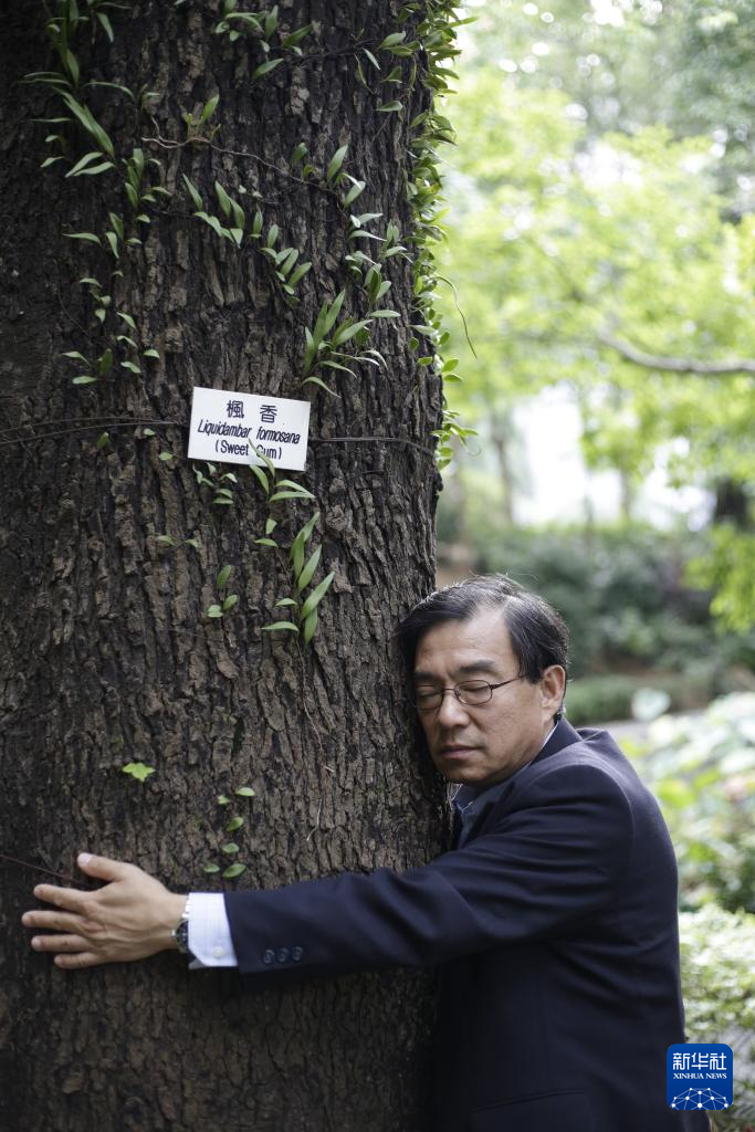 2015年,“樹博士”詹志勇在香港擁抱一棵楓香樹(受訪者本人供圖)。新華社發