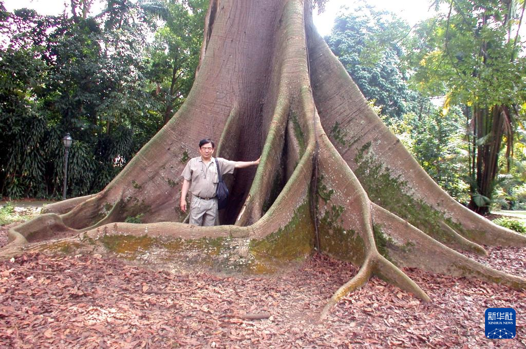 2003年,“樹博士”詹志勇在新加坡植物園和樹合影(受訪者本人供圖)。新華社發