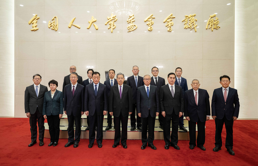 12月25日上午,全國人大常委會委員長趙樂際在北京人民大會堂向第六任全國人大常委會澳門特別行政區基本法委員會組成人員頒發任命書。這是頒發任命書后趙樂際等與上述人員合影。新華社記者 李濤 攝