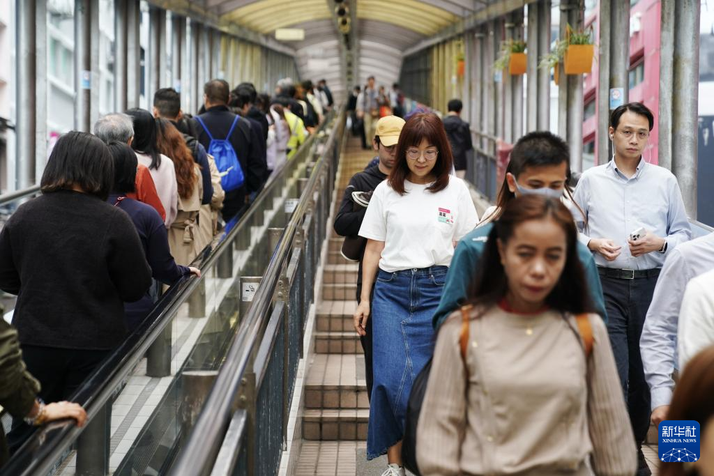 導賞員林嘉君(中)走在香港中環半山扶手電梯旁(11月21日攝)。新華社發(王申攝)