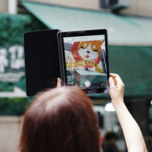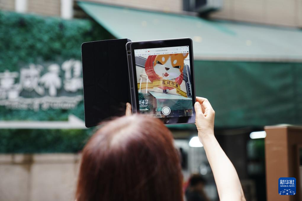 導賞員林嘉君在中環AR公共藝術“打卡”景點旁用平板電腦掃描二維碼,慵懶的“小嘉貓”躍然出現(11月21日攝)。新華社發(王申攝)