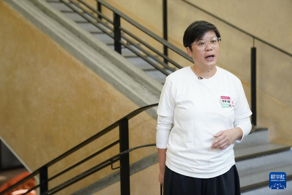導賞員嚴靜儀在香港中環街市接受采訪(11月21日攝)。新華社發(王申攝)
