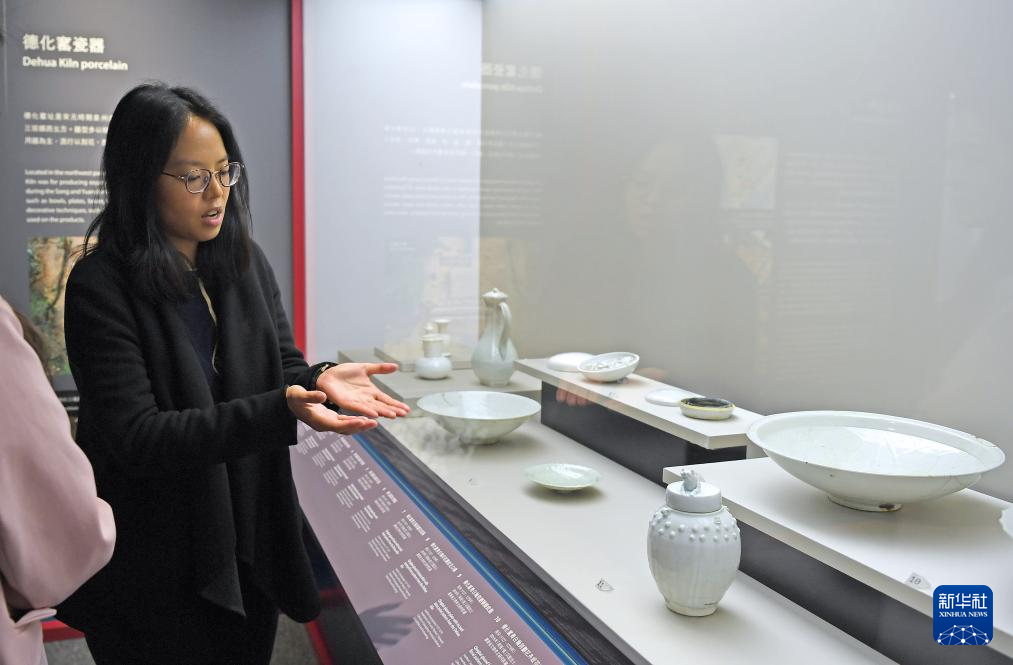 香港文物探知館一級助理館長李曉慧在講解“從灣區啟航:‘南海一號’與海上絲綢之路”展覽上的展品(2024年11月28日攝)。新華社記者 陳鐸攝
