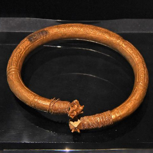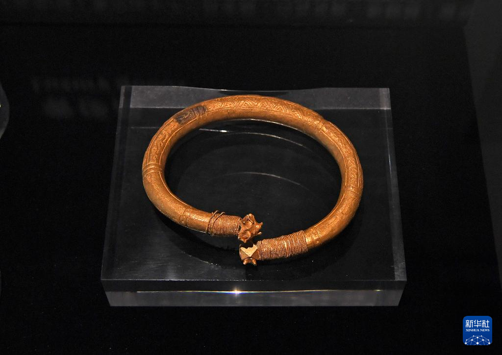 這是“從灣區啟航:‘南海一號’與海上絲綢之路”展覽上展出的鑲寶石空心金鐲(2024年11月28日攝)。新華社記者 陳鐸攝