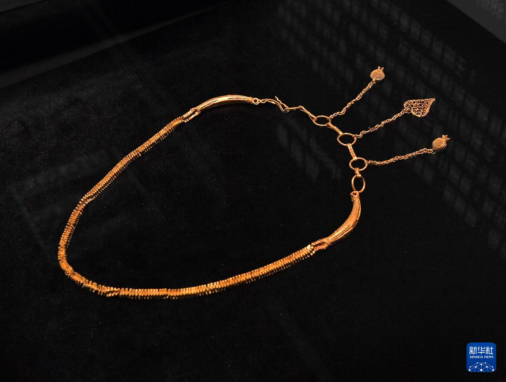這是“從灣區啟航:‘南海一號’與海上絲綢之路”展覽上展出的金單頂鏈犀角形錐筒飾項鏈(2024年11月28日攝)。新華社記者 陳鐸攝