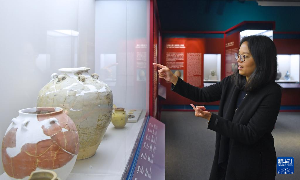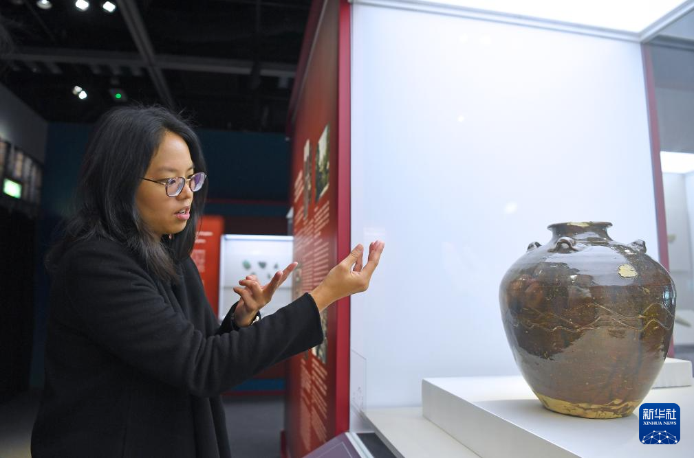 香港文物探知館一級助理館長李曉慧在講解“從灣區啟航:‘南海一號’與海上絲綢之路”展覽上展出的南海窯醬釉“淳熙十年”印文四系罐(2024年11月28日攝)。新華社記者 陳鐸攝