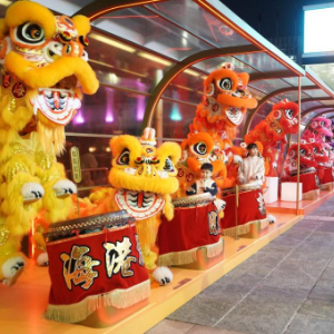 維多利亞港畔,一連串擺起18只色彩鮮艷的醒獅,帶來繽紛的祝福:飛“黃”騰達、一炮而“紅”、平步“青”云……