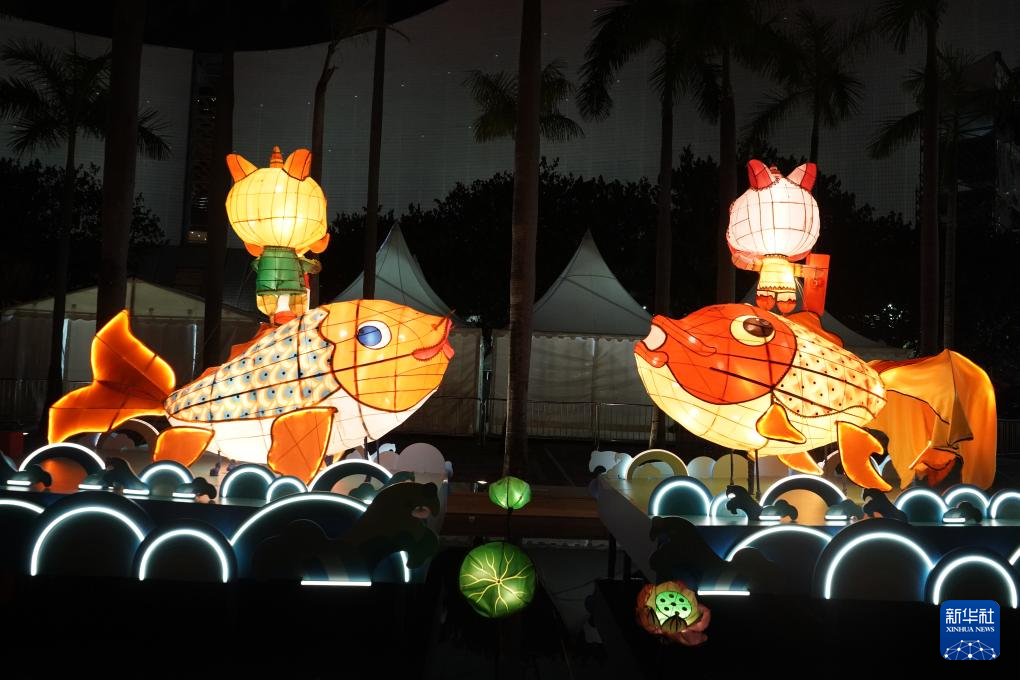 香港文化中心露天廣場上,一組由香港非物質文化遺產辦事處策劃的扎作彩燈與四周景色相映成趣,錦鯉與金魚在水池上躍動,小醒獅站在魚背上嬉戲。