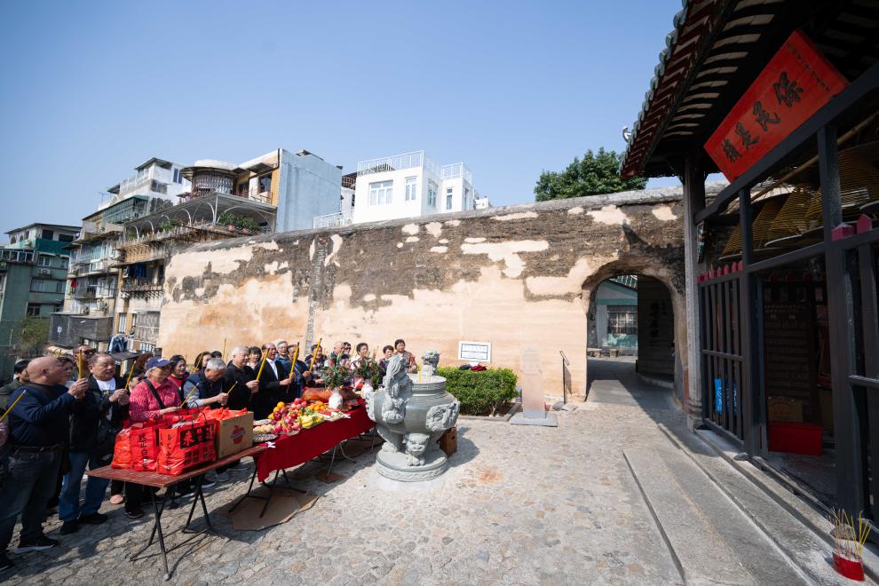 2月16日,澳門哪吒信俗國家級非遺項目代表性傳承人葉達帶領成員和街坊在大三巴哪吒廟前舉行新春祈福。新華社發(張金加 攝)