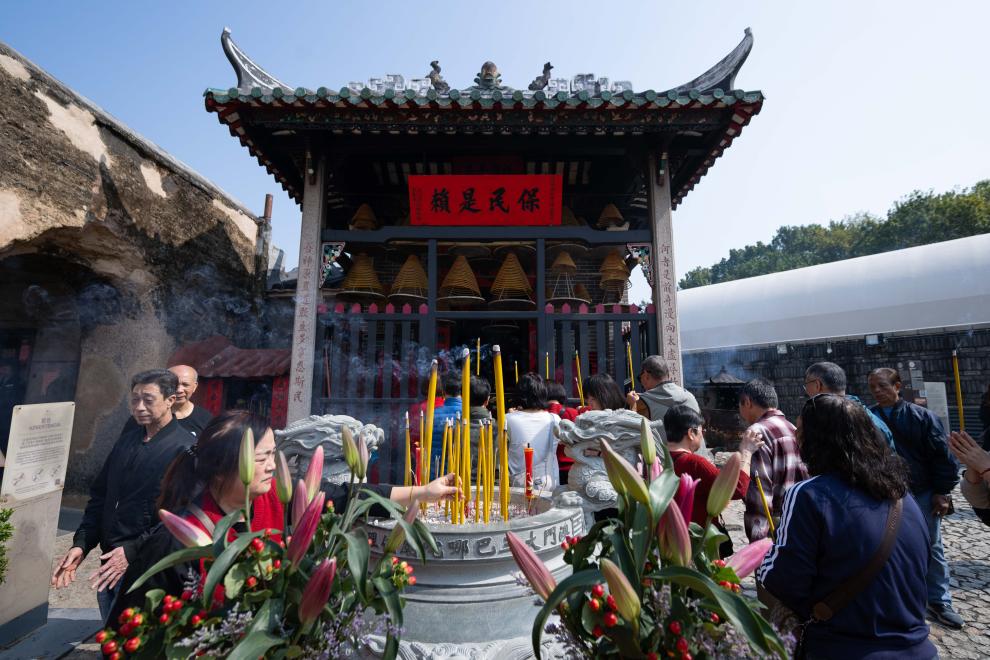 2月16日,人們在澳門大三巴哪吒廟前上香。新華社發(張金加 攝)