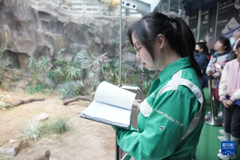香港海洋公園動物部護理專員劉思穎在賽馬會四川奇珍館內記錄大熊貓的狀況(2025年1月16日攝)。新華社記者 褚萌萌 攝